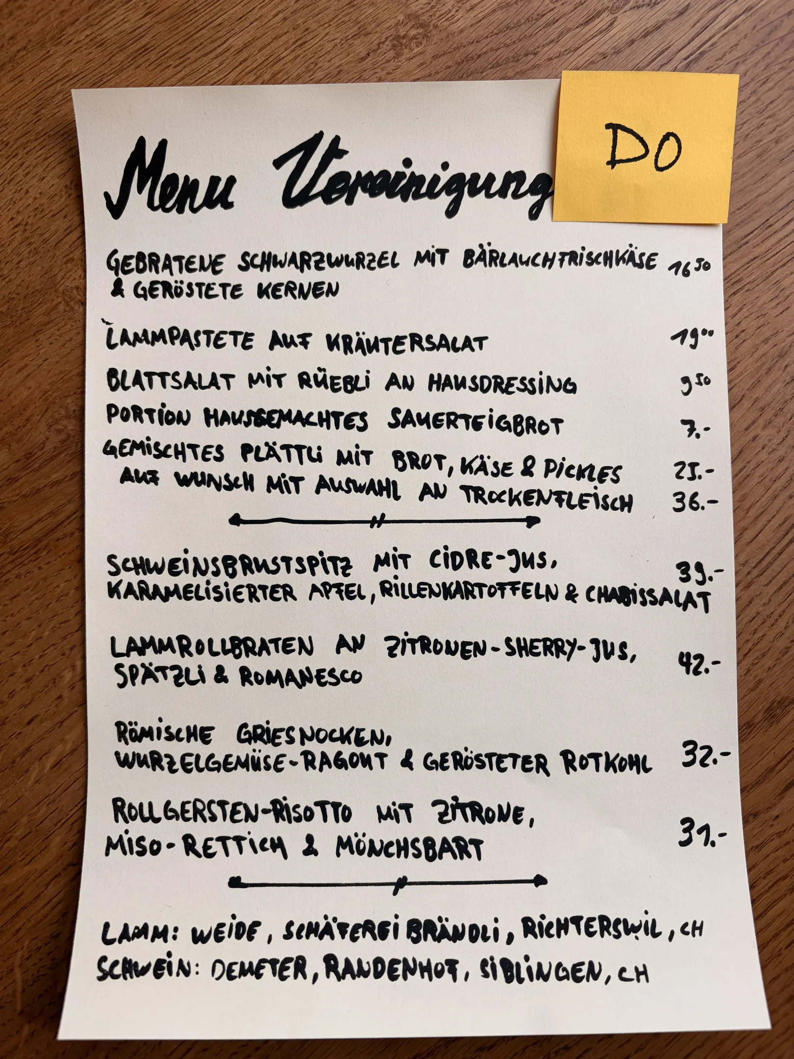 Wir wollen in unserer Beiz so wenig Kompromisse wie möglich eingehen und stehen hinter dem, was wir anbieten. Uns liegt eine leidenschaftliche, bodenständige, sozial- und umweltverträgliche Gastronomie am Herzen. Dazu gehört, dass wir die Vereinigung als Quartierbeiz verstehen. Wir freuen uns über einen Besuch zum ausgedehnten Abendessen von Aperitif bis Digestif und allem dazwischen. Genauso heissen wir euch aber auch willkommen zu einem Feierabendbier, Drink vor dem Ausgang oder Schlumi auf dem Nachhauseweg. Am langen Tresen darf durchaus gegessen werden und wenn es voll ist, wird der Tisch auch mal mit anderen Gästen geteilt.