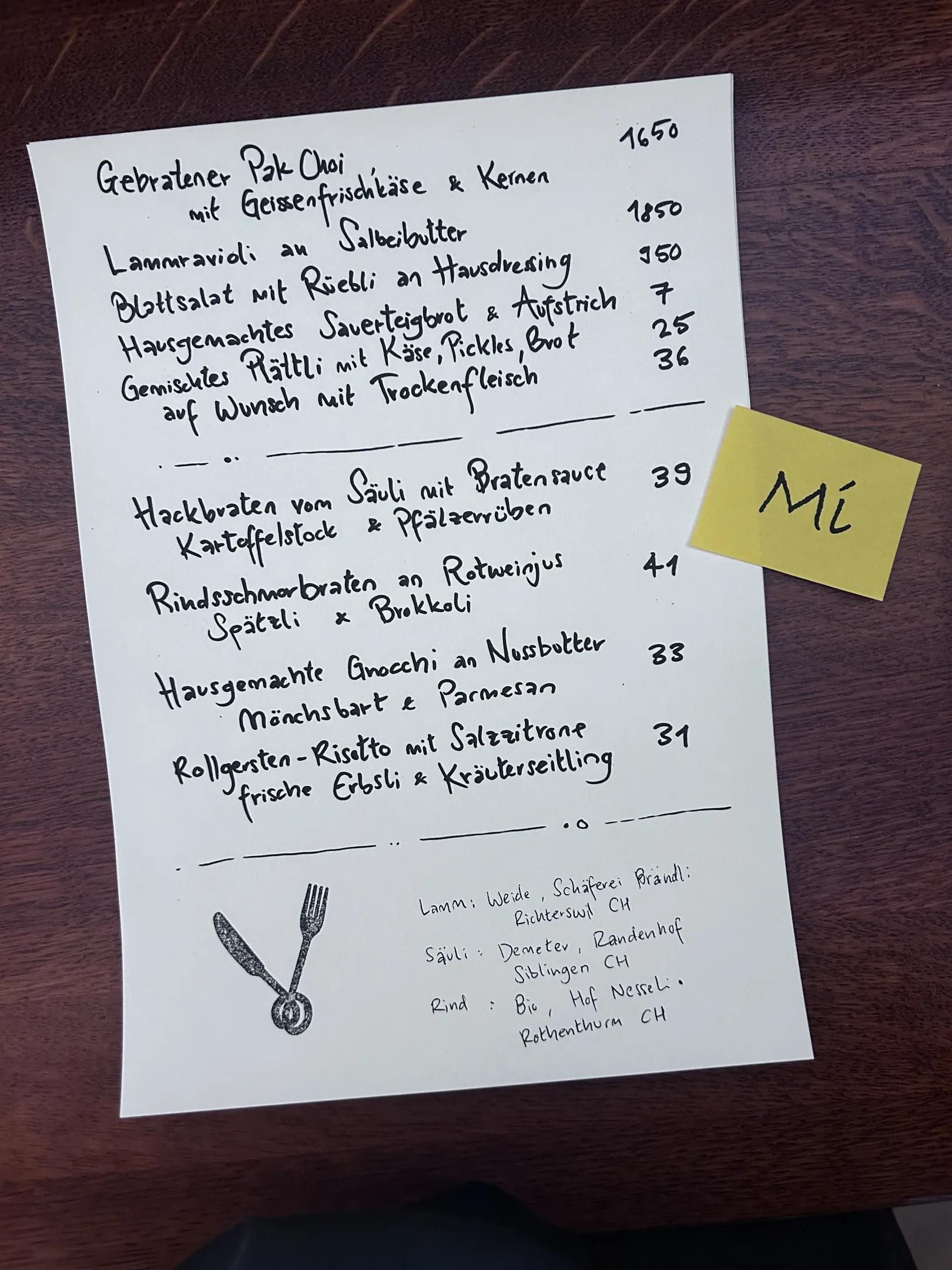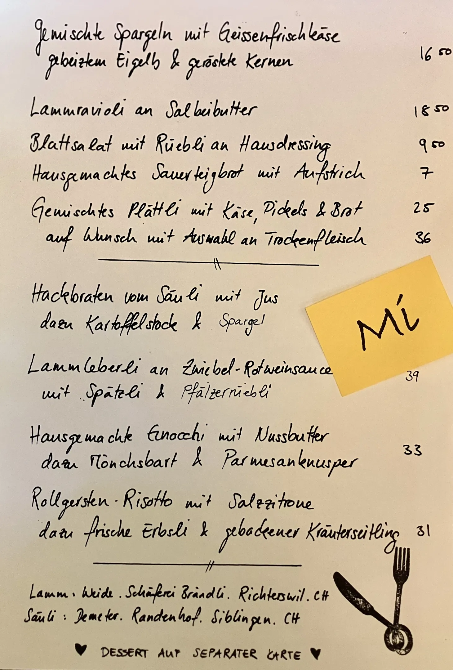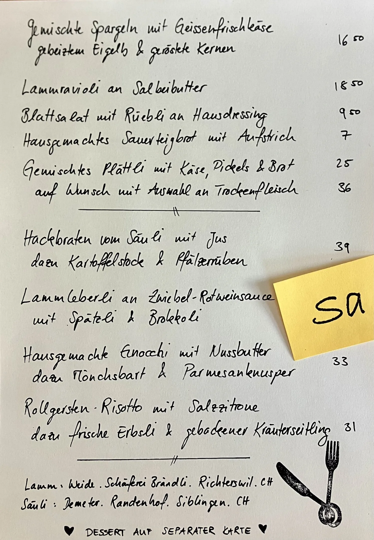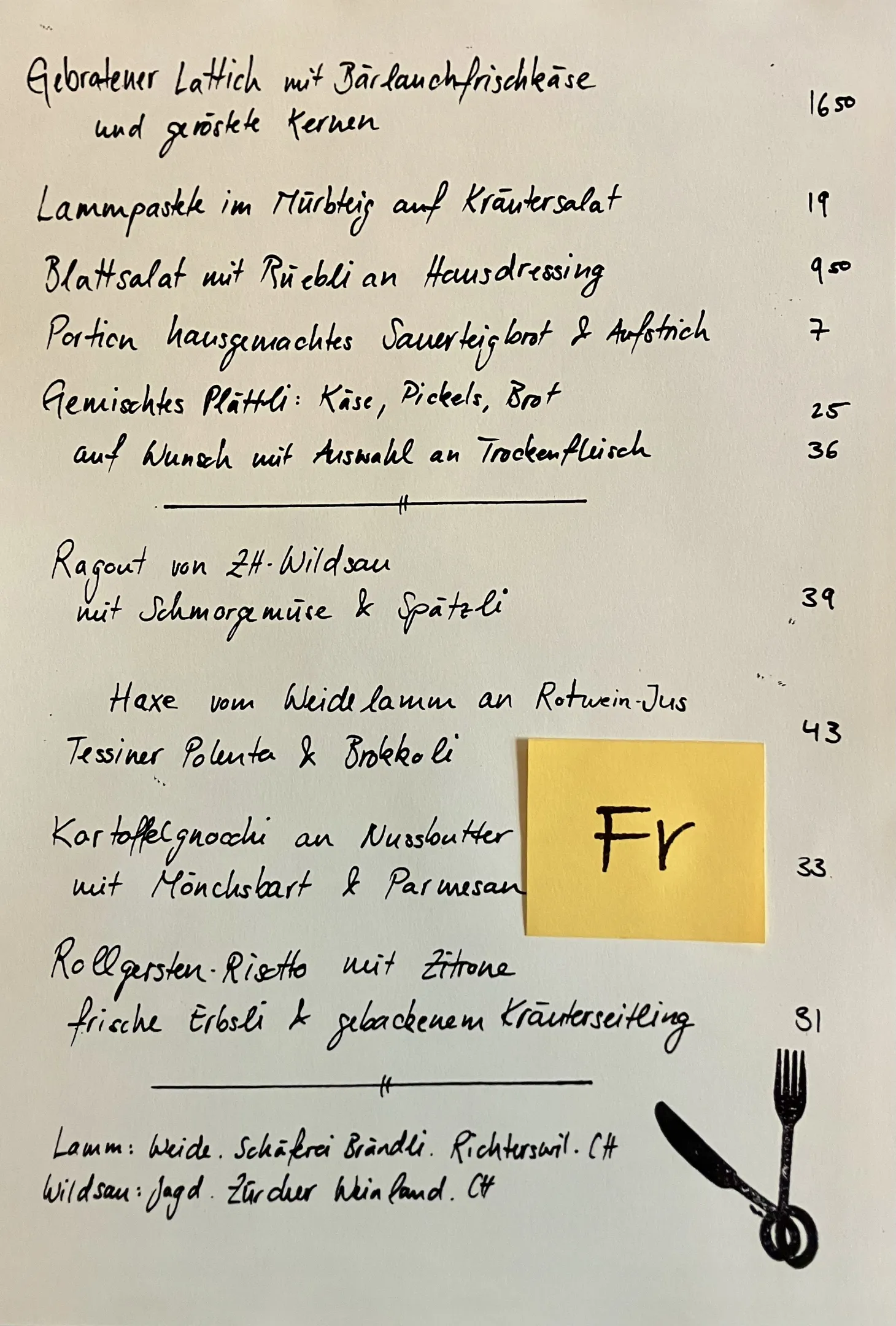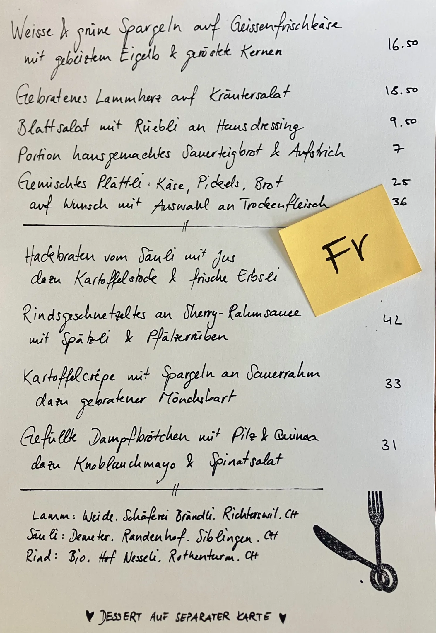 Bei der Kreation des Menus lassen wir uns von der Saisonalität und dem aktuellen Angebot unserer lokalen Partner:innen leiten. Neben Klassikern der Schweizer Küche finden sich bei uns Gerichte mit Einflüssen aus ganz Europa. Zur Auswahl stehen immer auch vegetarische sowie eine vegane Option.