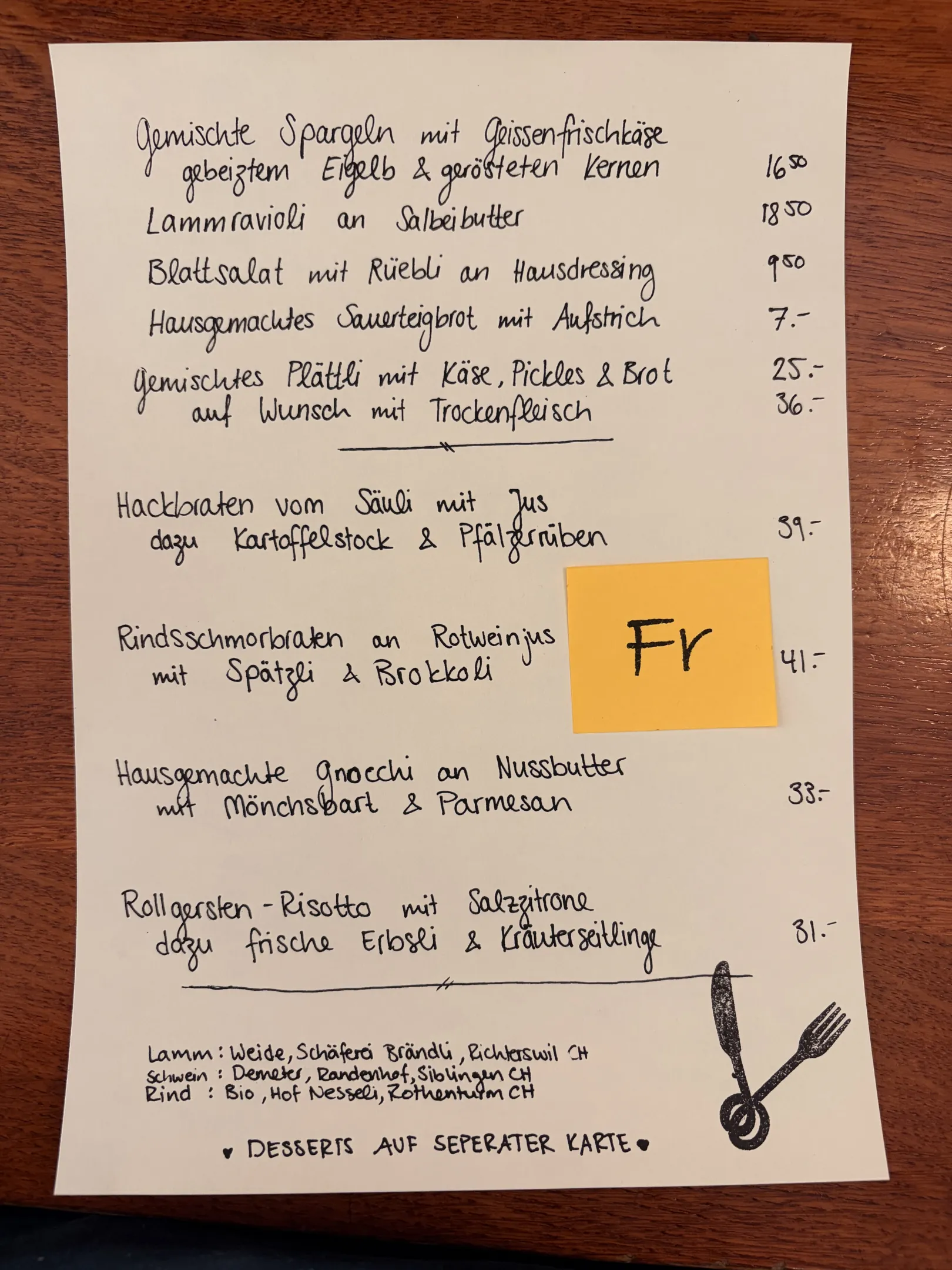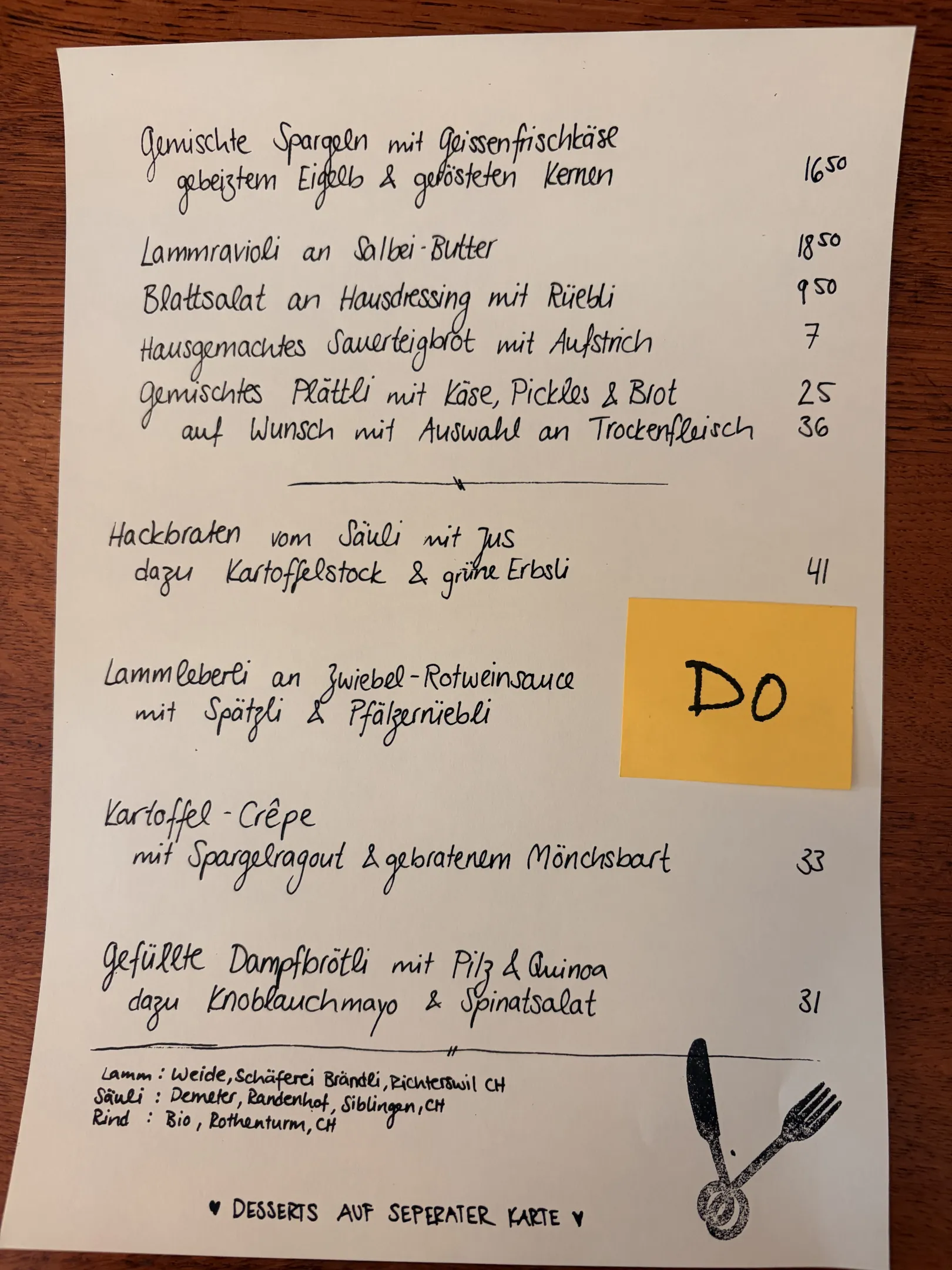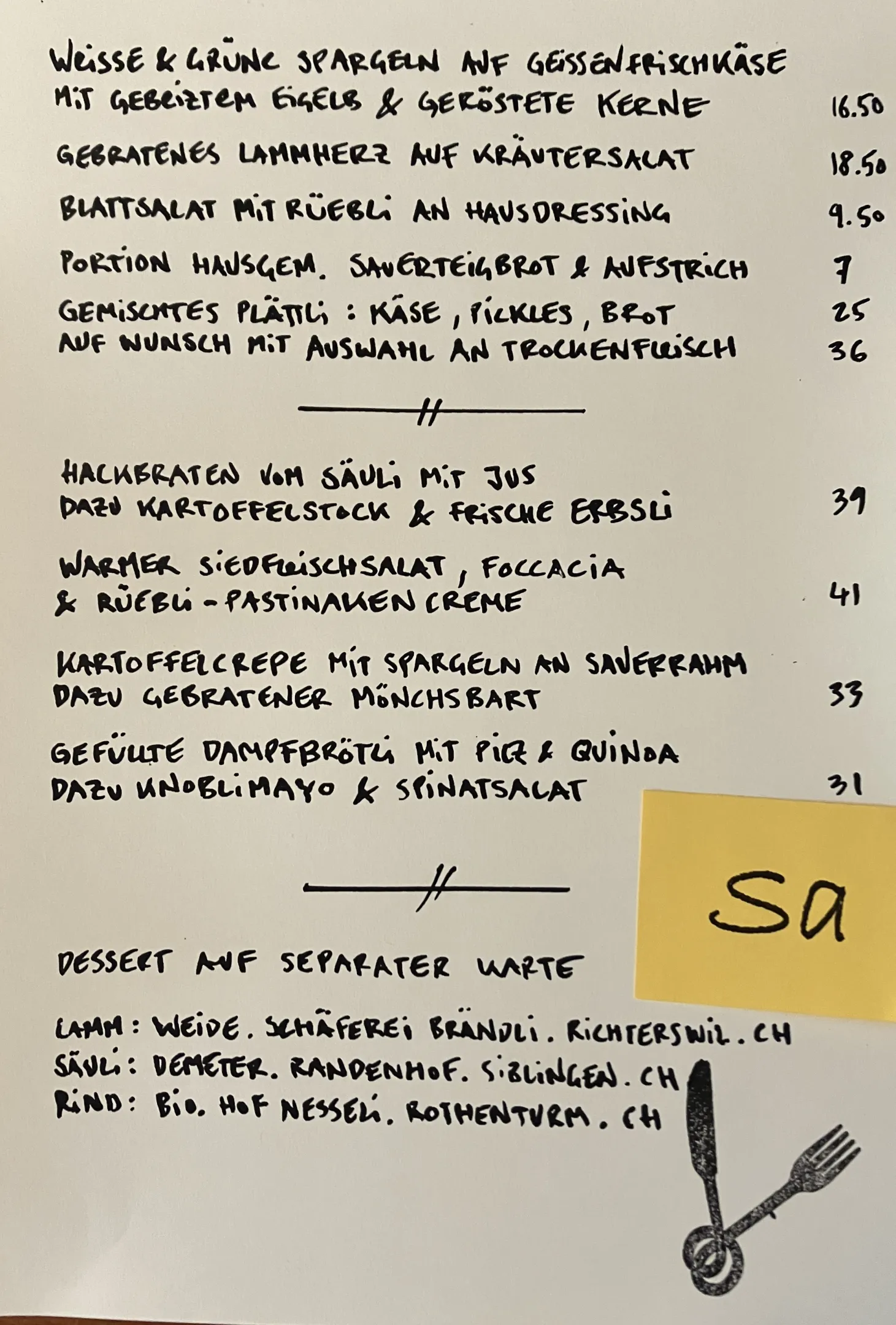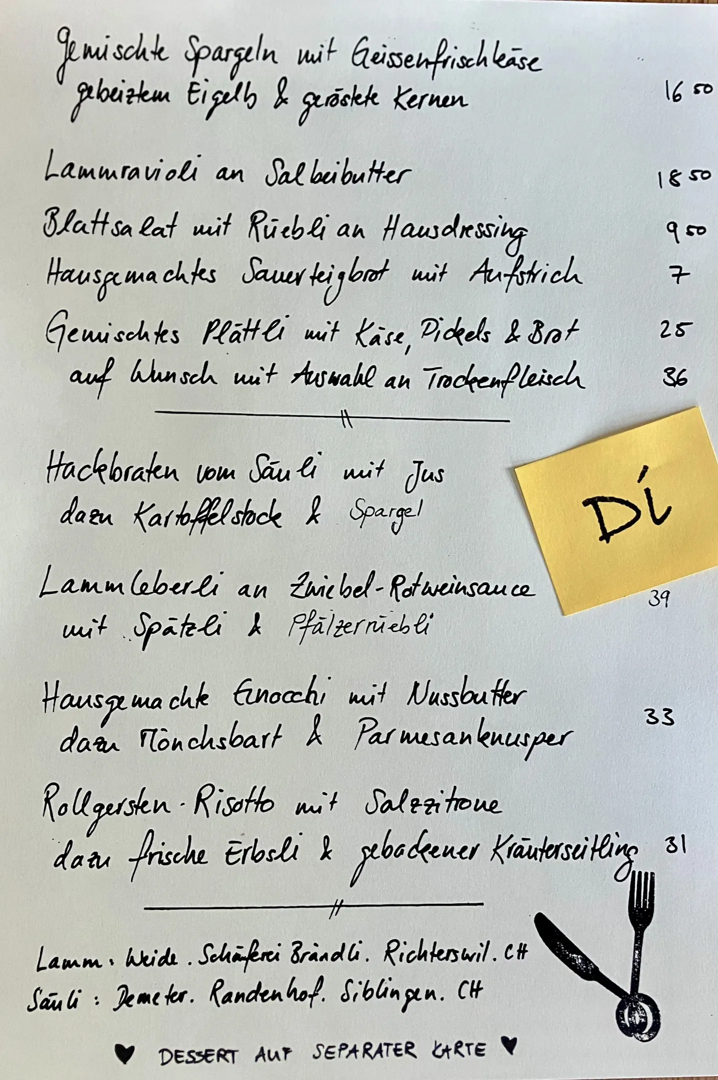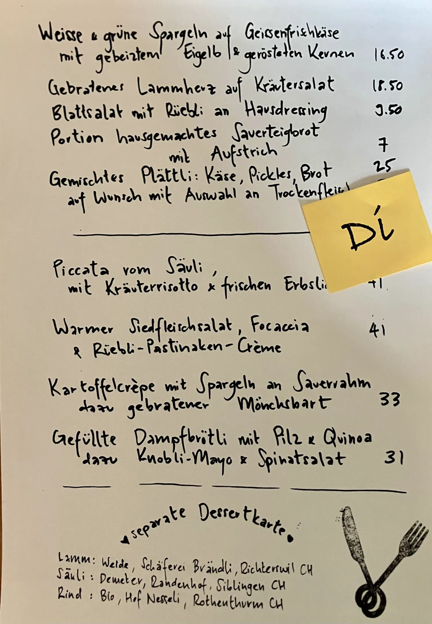 Bei der Kreation des Menus lassen wir uns von der Saisonalität und dem aktuellen Angebot unserer lokalen Partner:innen leiten. Neben Klassikern der Schweizer Küche finden sich bei uns Gerichte mit Einflüssen aus ganz Europa. Zur Auswahl stehen immer auch vegetarische sowie eine vegane Option.
